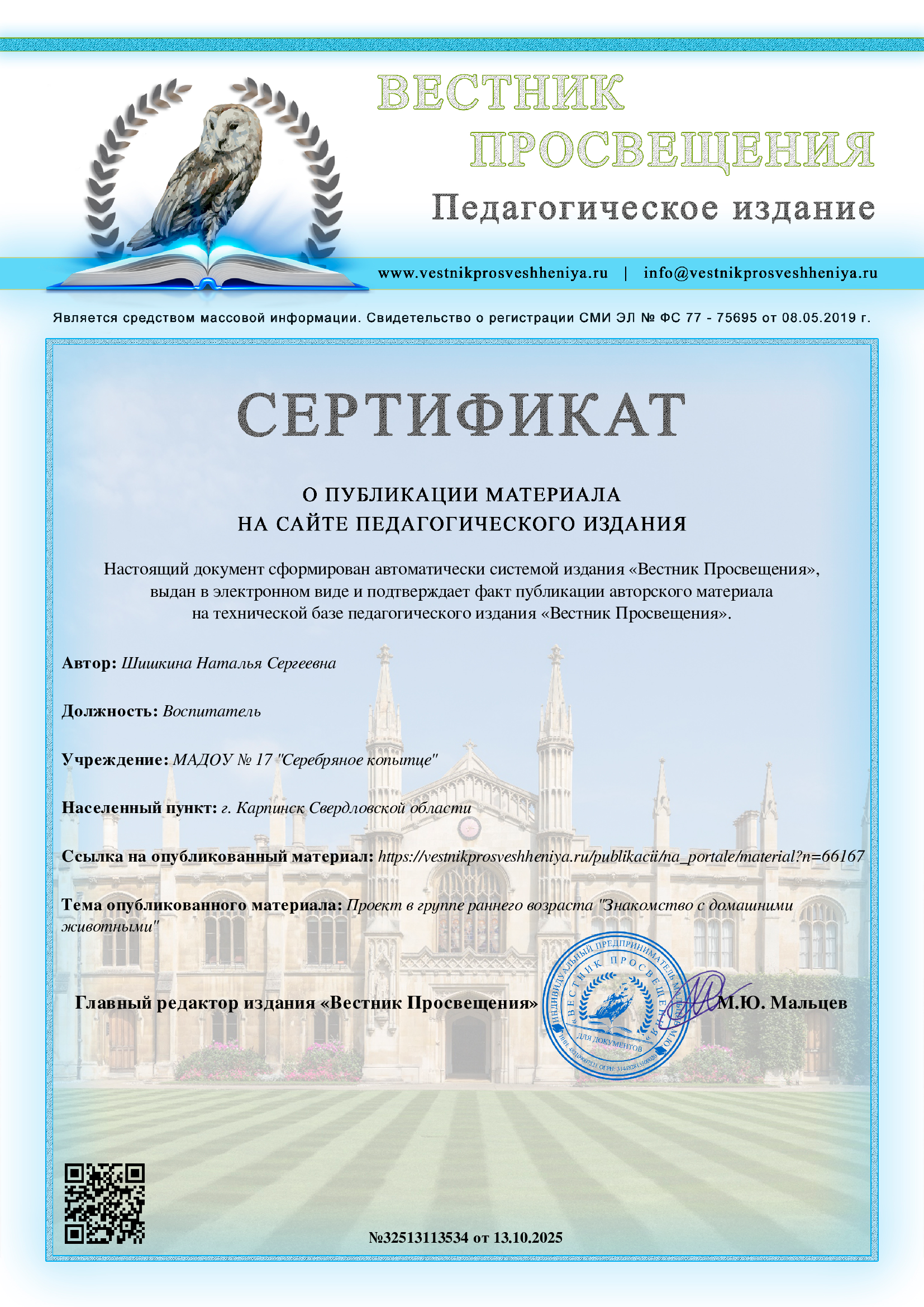 Сертификат за публикацию материала в "Вестнике просвещения"